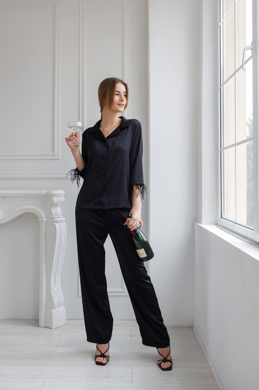 Елегантний шовковий костюм з пір’ям на рукавах 118-23