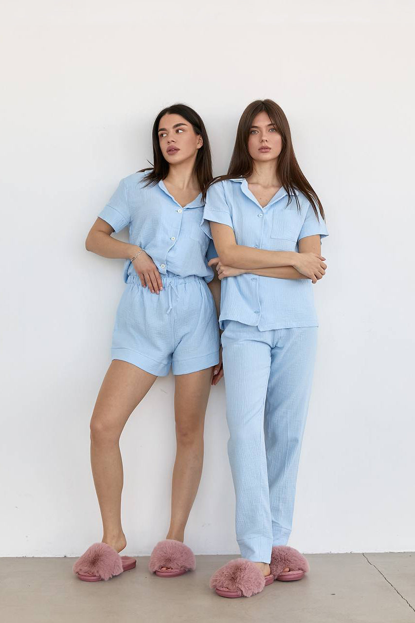 Комплект пошитий з натуральної дихаючої тканини. Сорочка на ґудзиках вільного крою з накладним карманом. Шорти вільного пошиття з широкою резинкою та зав‘язками. Штани високої посадки знизу мають манжети, резинка на поясі тонка, прошита.