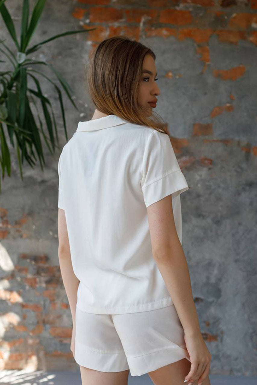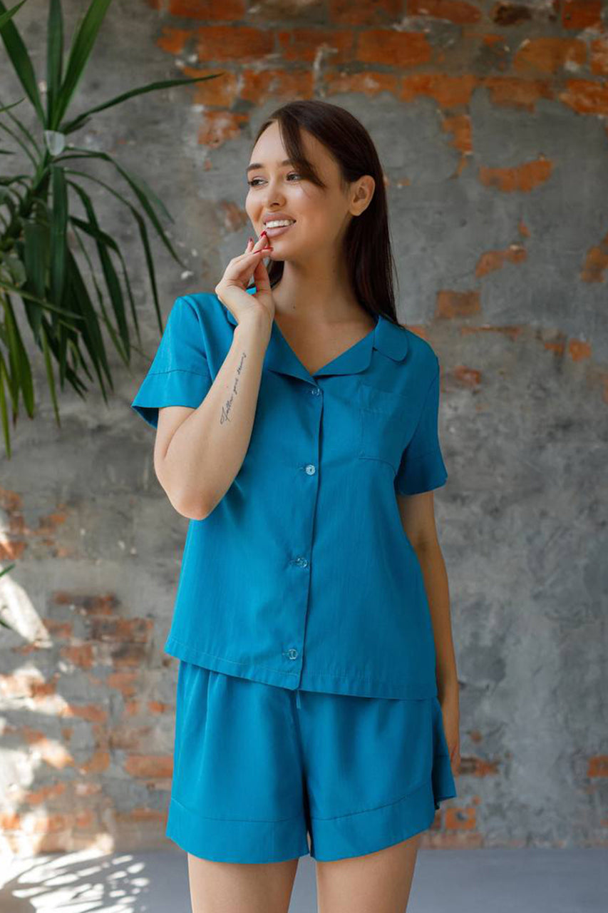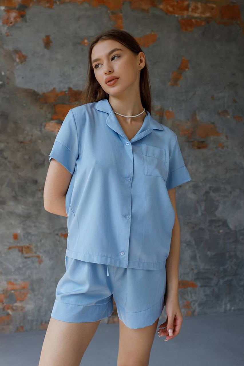 Сорочка вільного пошиття на ґудзиках з накладною кишенею на грудях. Шорти на резинці із зав’язками мають також вільний крій, не облягають😍