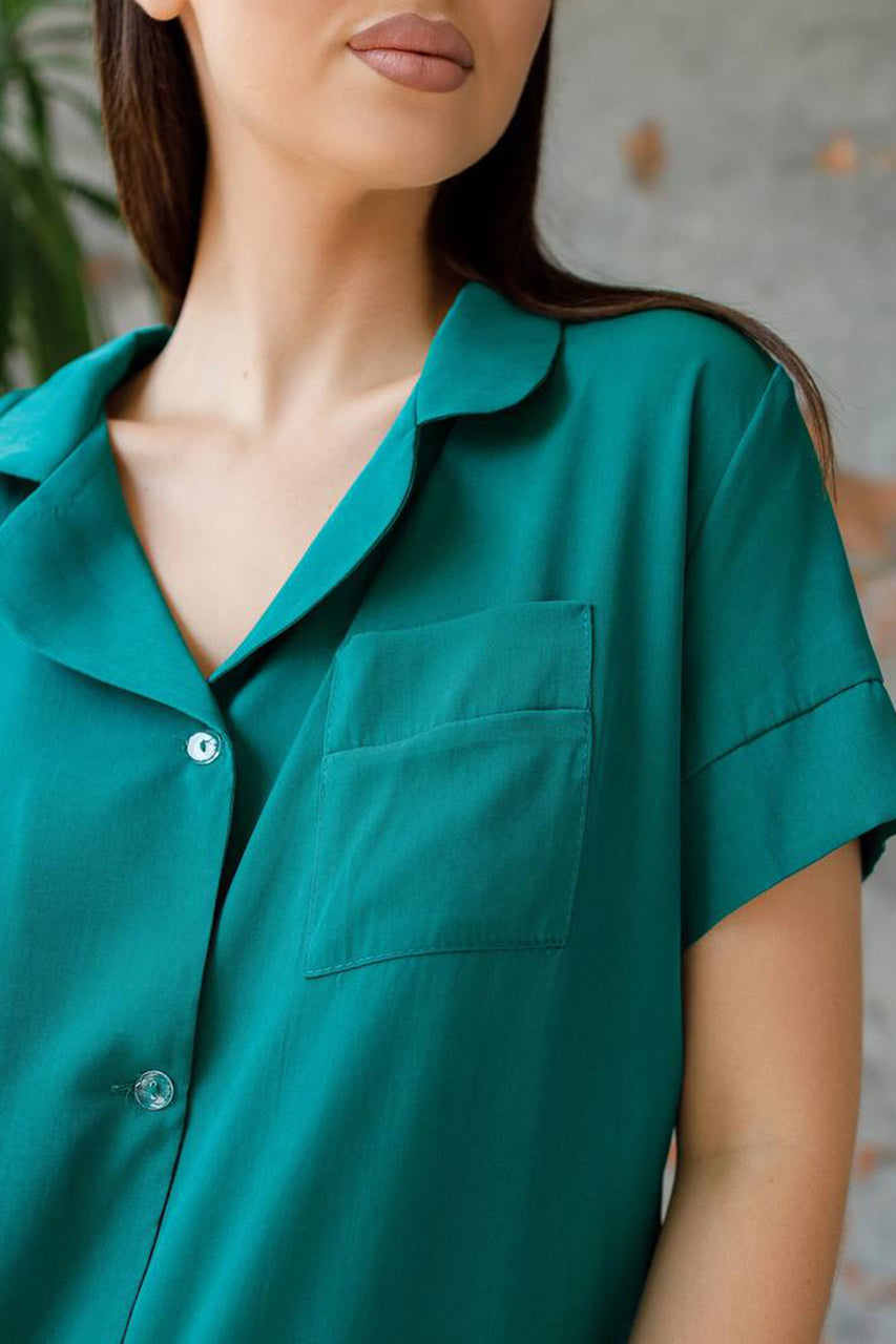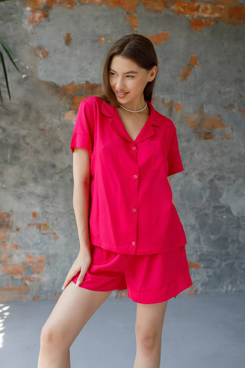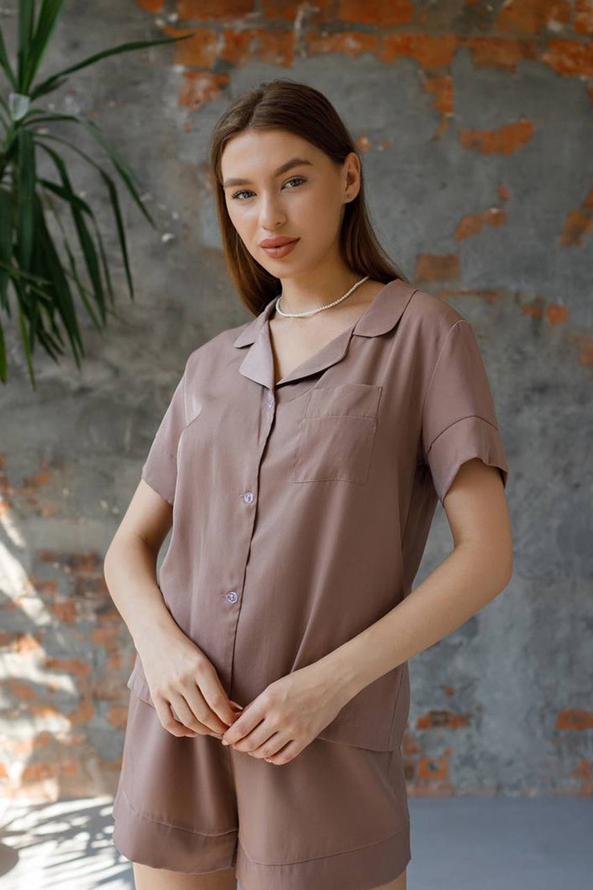 Сорочка вільного пошиття на ґудзиках з накладною кишенею на грудях. Шорти на резинці із зав’язками мають також вільний крій, не облягають😍