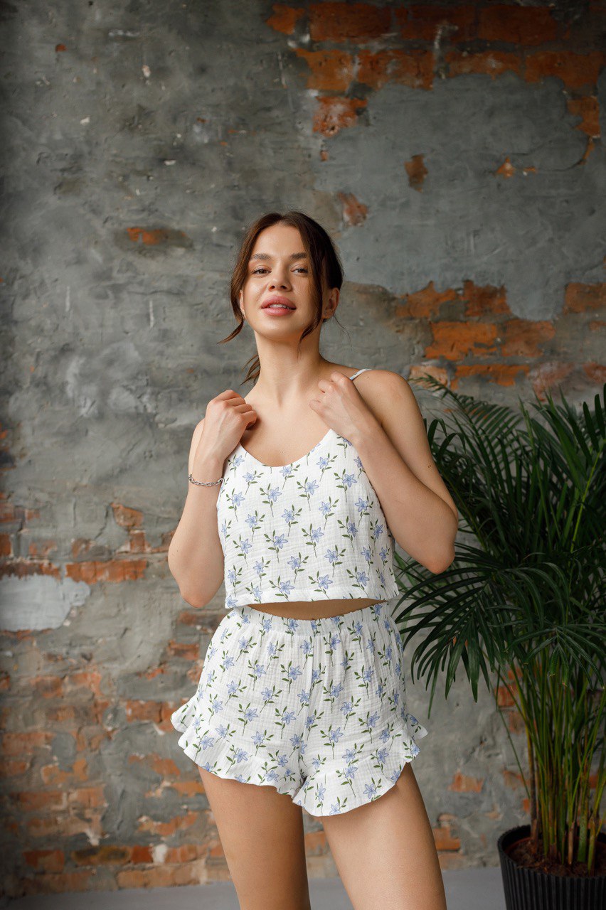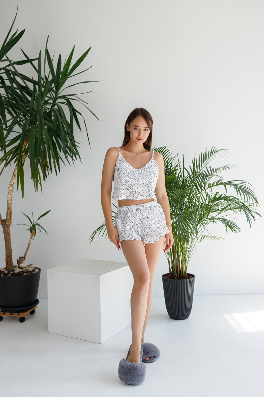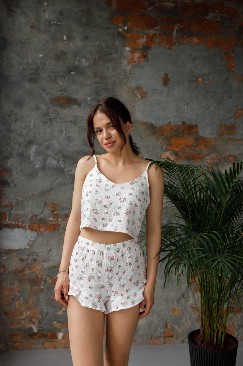 Зваблива літня піжама з натуральної тканини ❤️🔥. Ідеально підходить для сну та відпочинку 😍. Укорочена майка, сексі шорти, бретельки регулюються. Вверх не просвічується ☝️